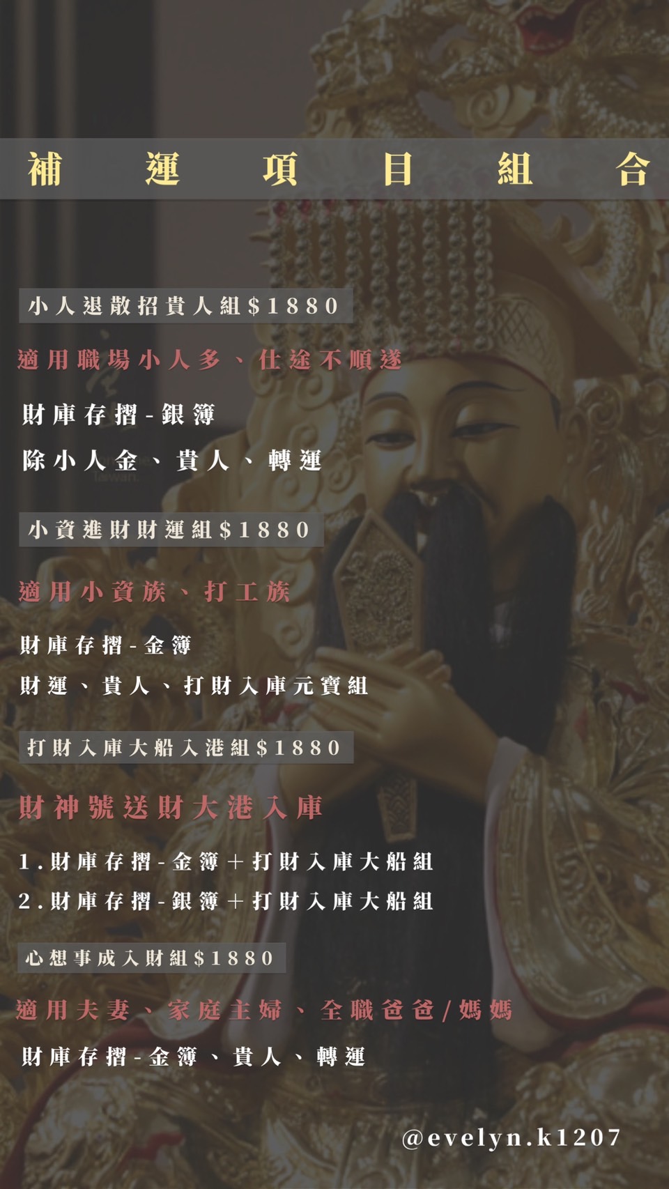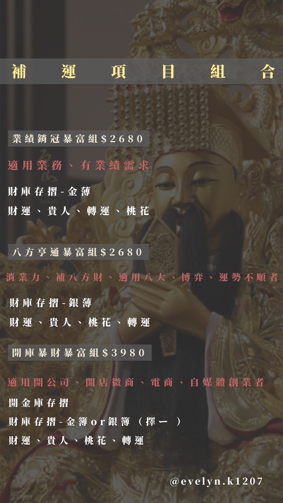 開庫補財暴富組 $3980 : 金簿/ 開金庫 / 財運 / 貴人 / 桃花 / 轉運